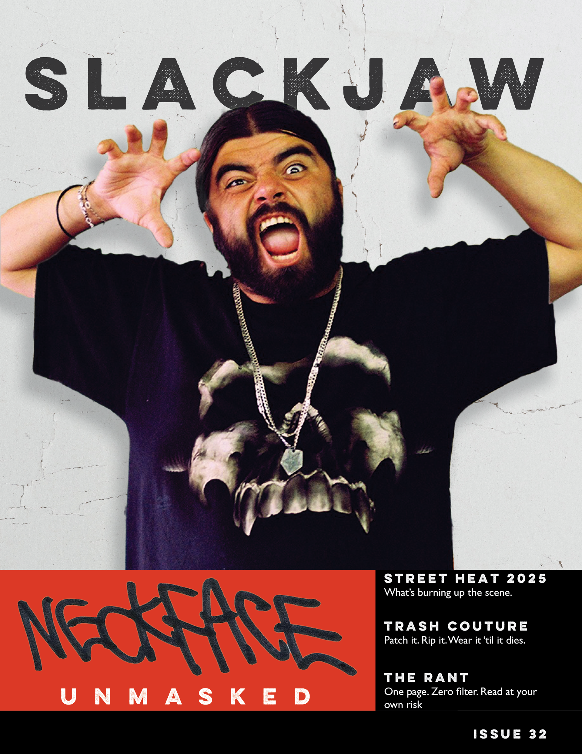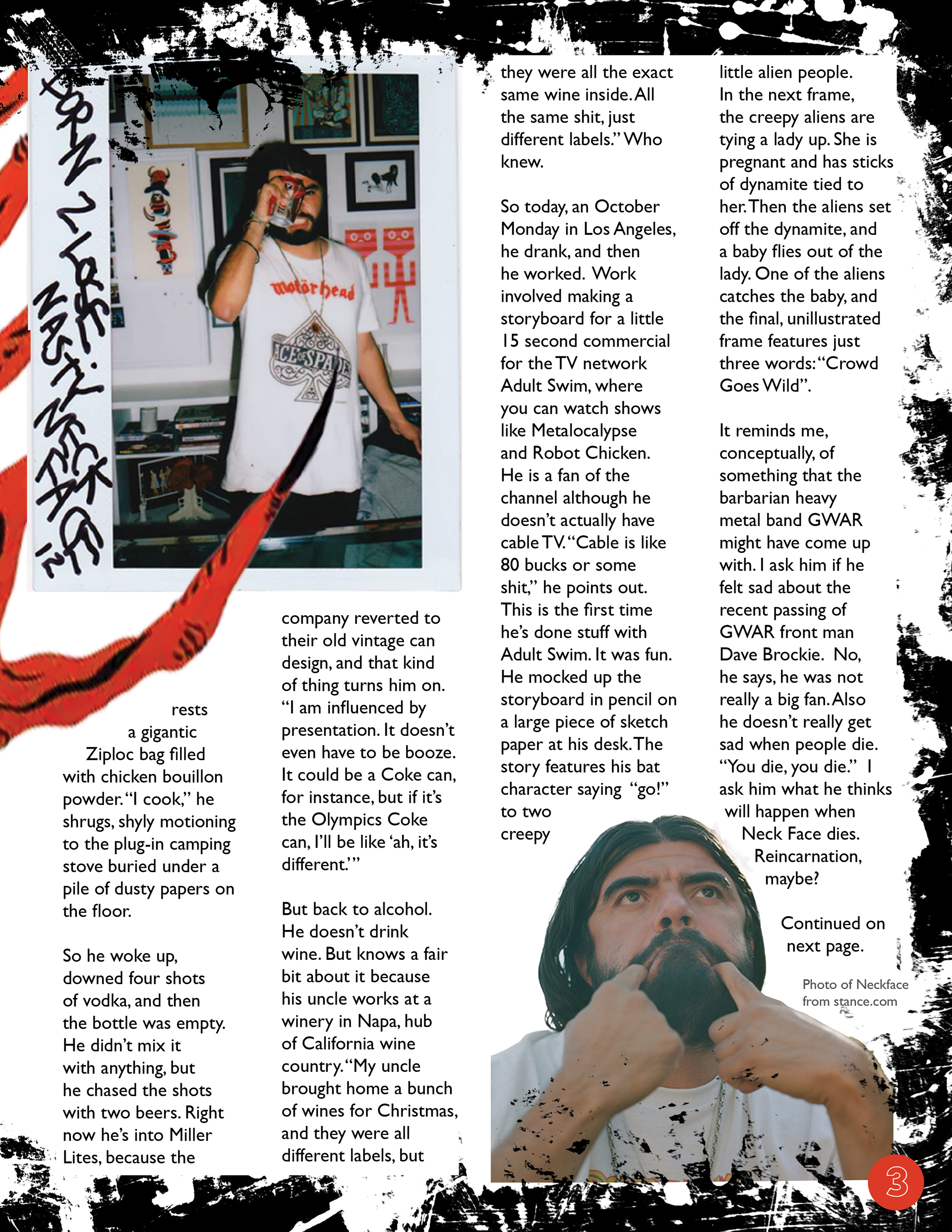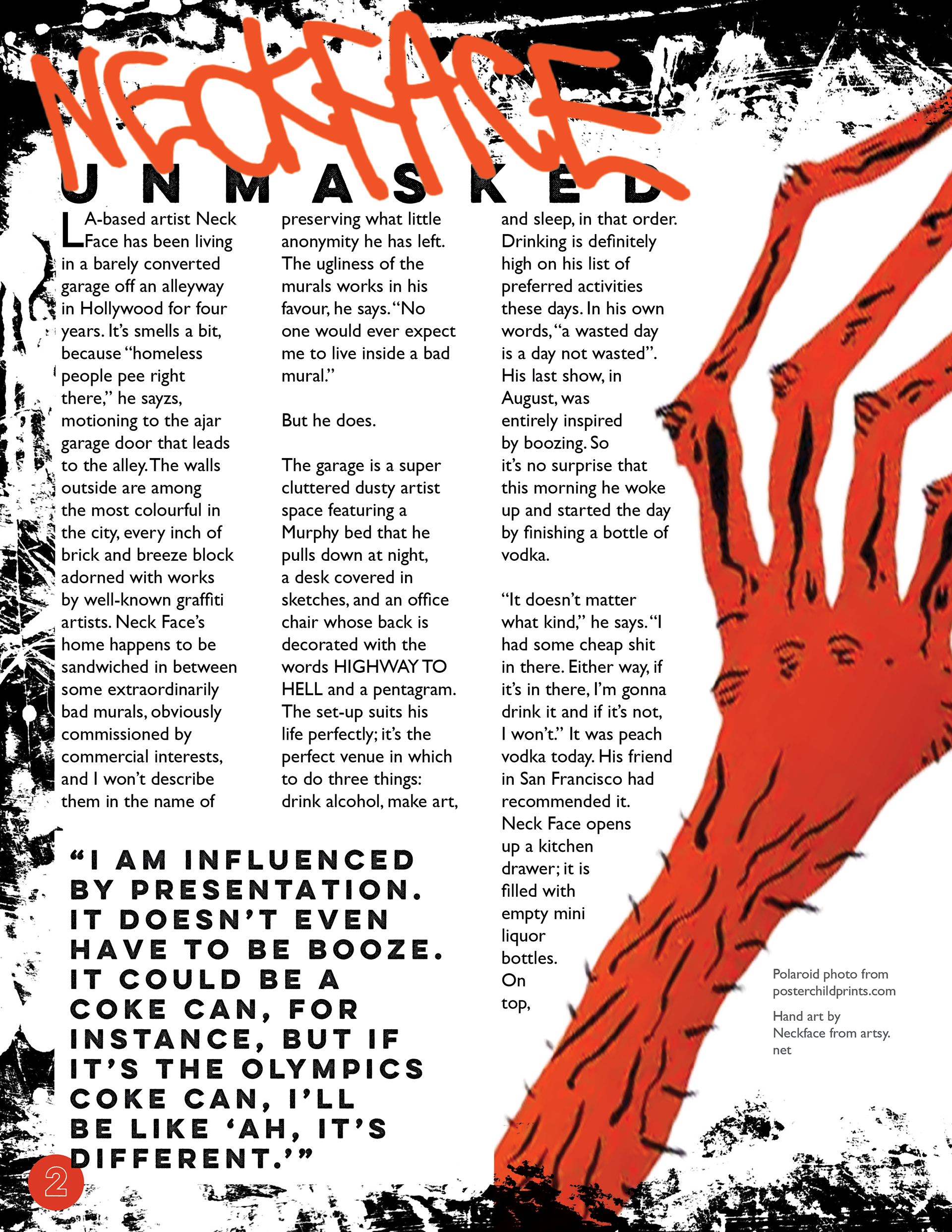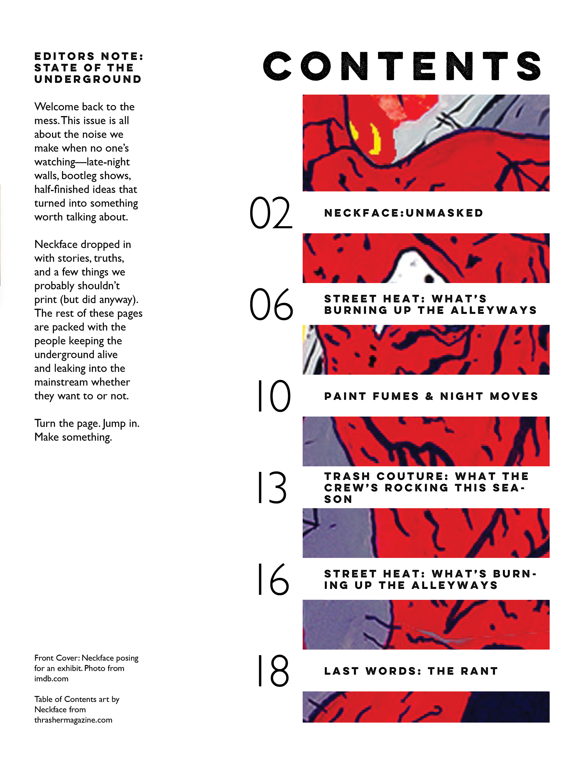 This layout is designed for a feature story on NeckFace, an LA-based artist whose work I enjoy. It is meant to emulate the look and feel of the skateboard magazines I grew up reading; gritty yet well-structured. This project includes a cover, table of contents, and a spread with a featured article. The article is from Huck Magazine and written by Caroline Ryder. All images are from the internet and are credited within the layout.