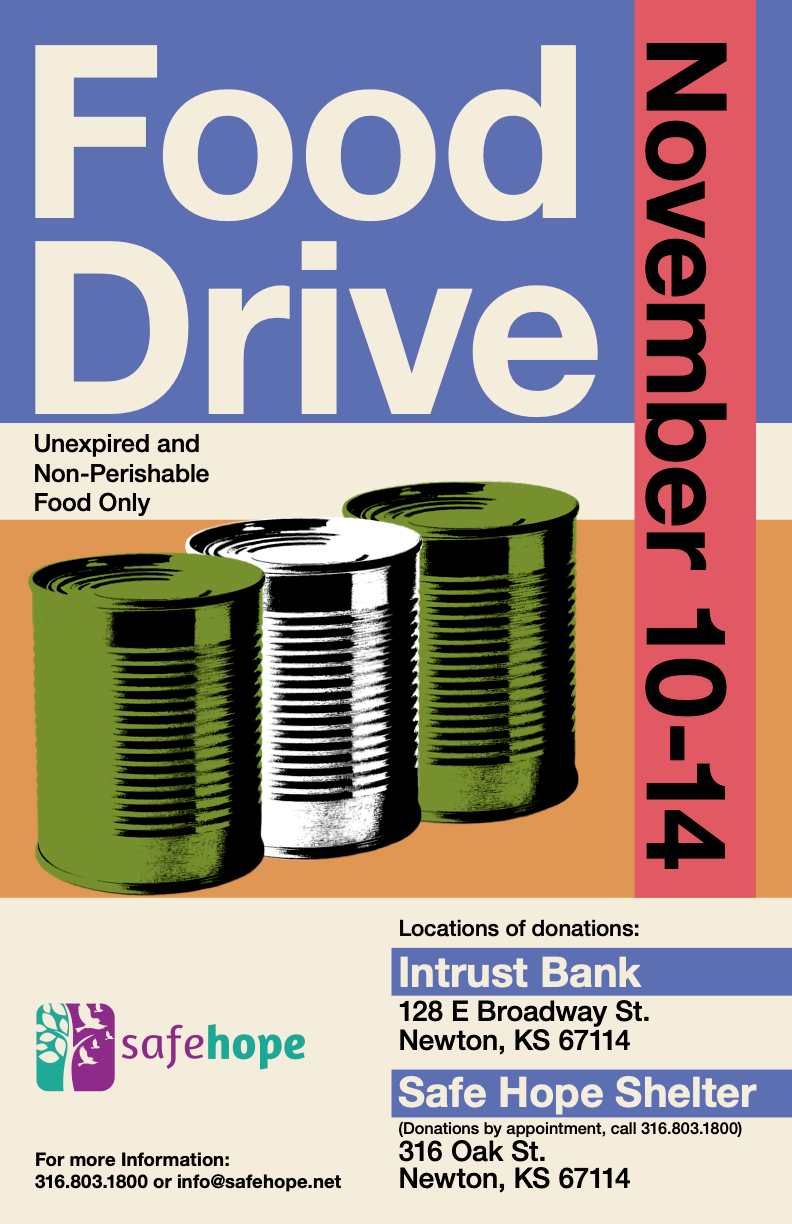 Our class was tasked with creating food drive posters for SafeHope, a domestic and sexual violence advocacy service provider in Newton, Kansas. We were allowed to be creative as we liked, within reason, to focus on layouts and hierarchy. My poster takes inspiration from Swiss design principles and is designed to be eye-catching and clean.