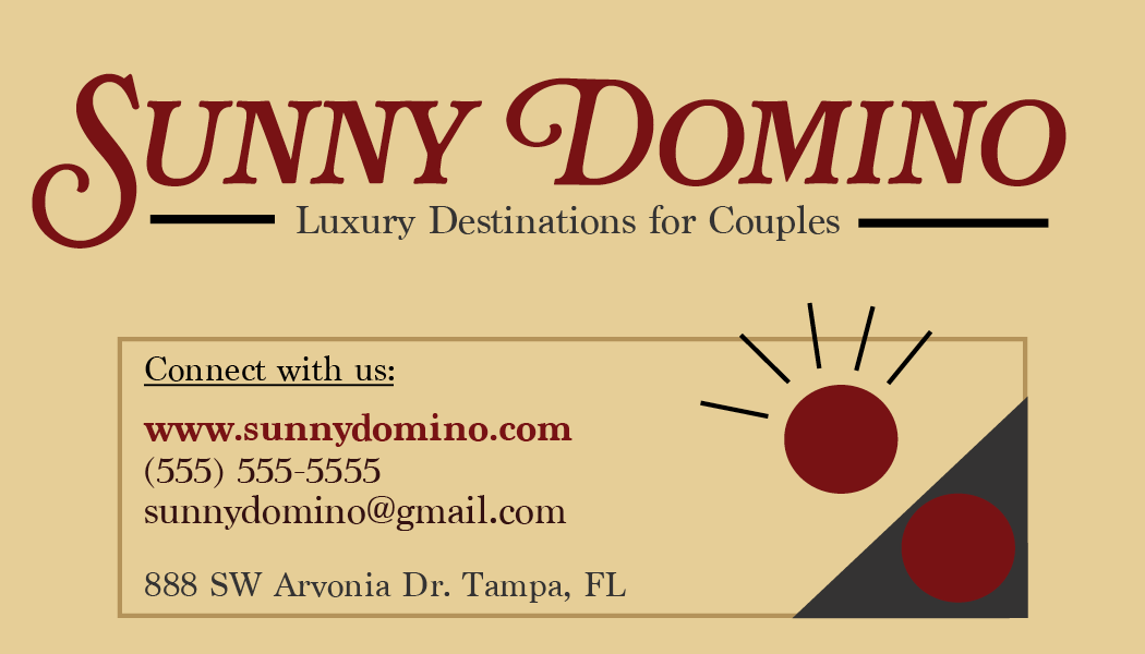 For this project, we were given a company brief to create a business card for. I received the Sunny Domino, which is a travel agency that helps couples find luxury vacation destinations for couples.